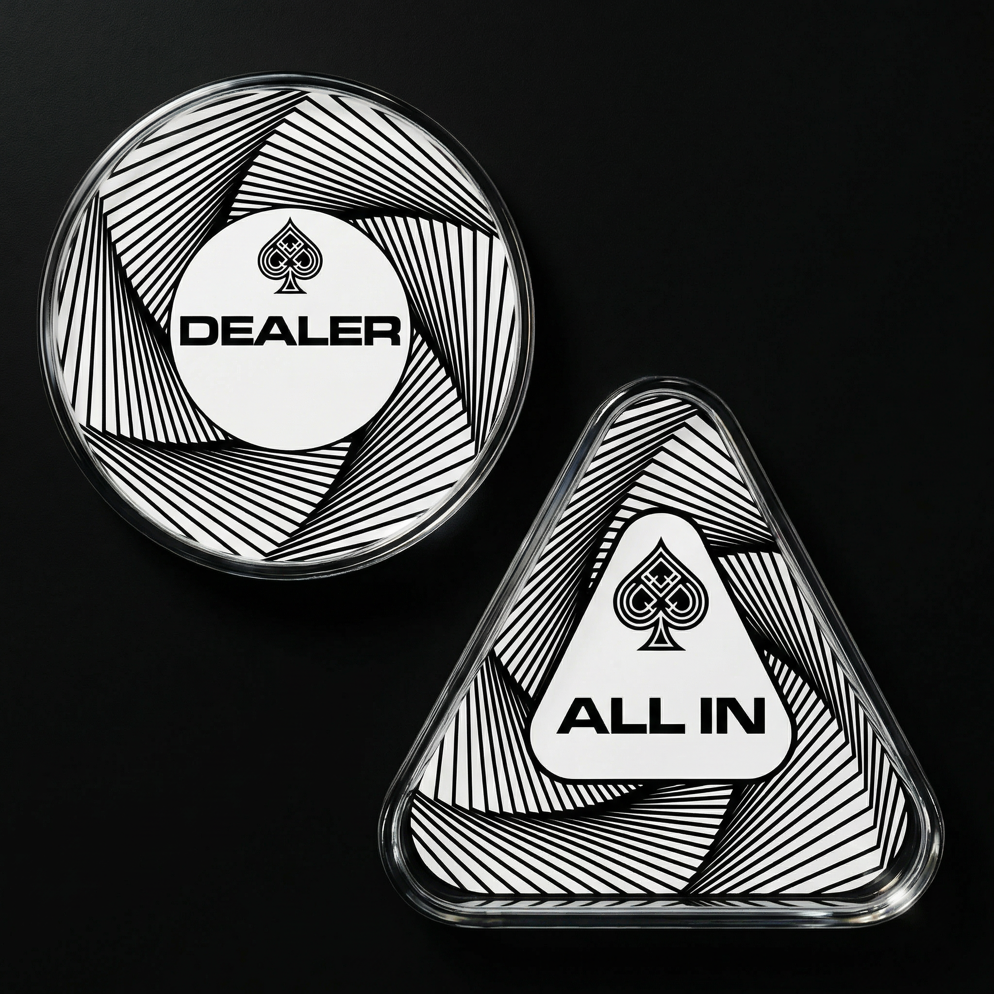 Buttons: Dealer und All-In Buttons aus Acrylglas. Der Dealer Button hat die Maße 60mm/10mm. Das All-In Triangle 65mm/12mm.
